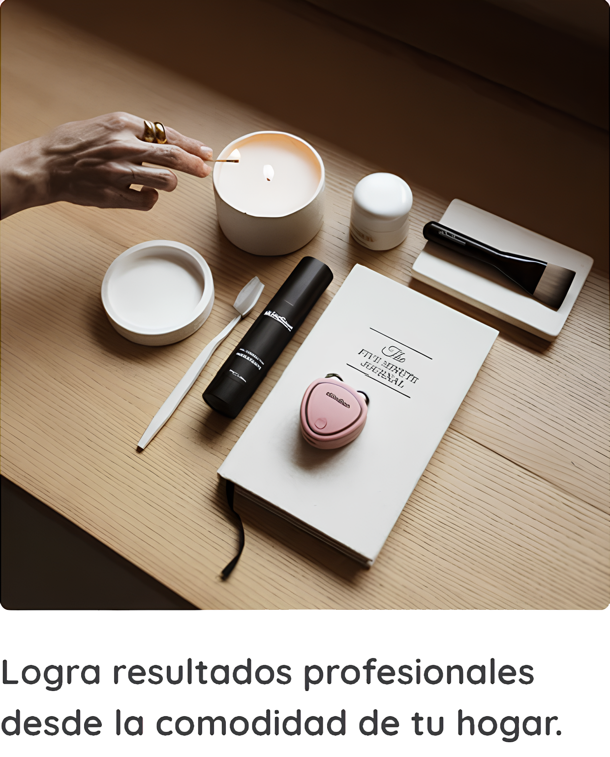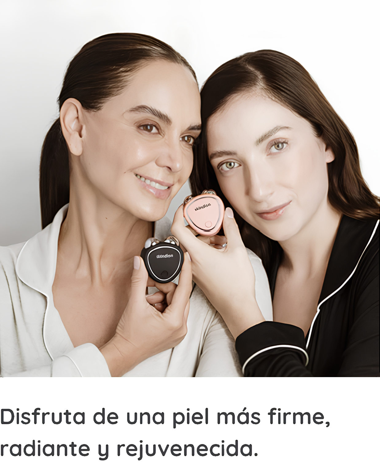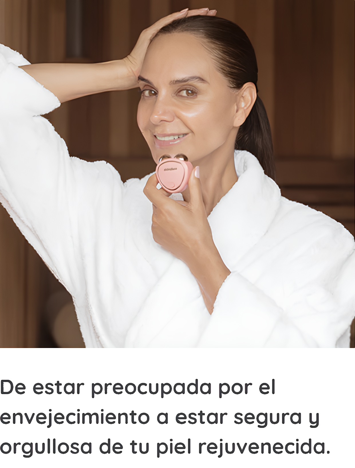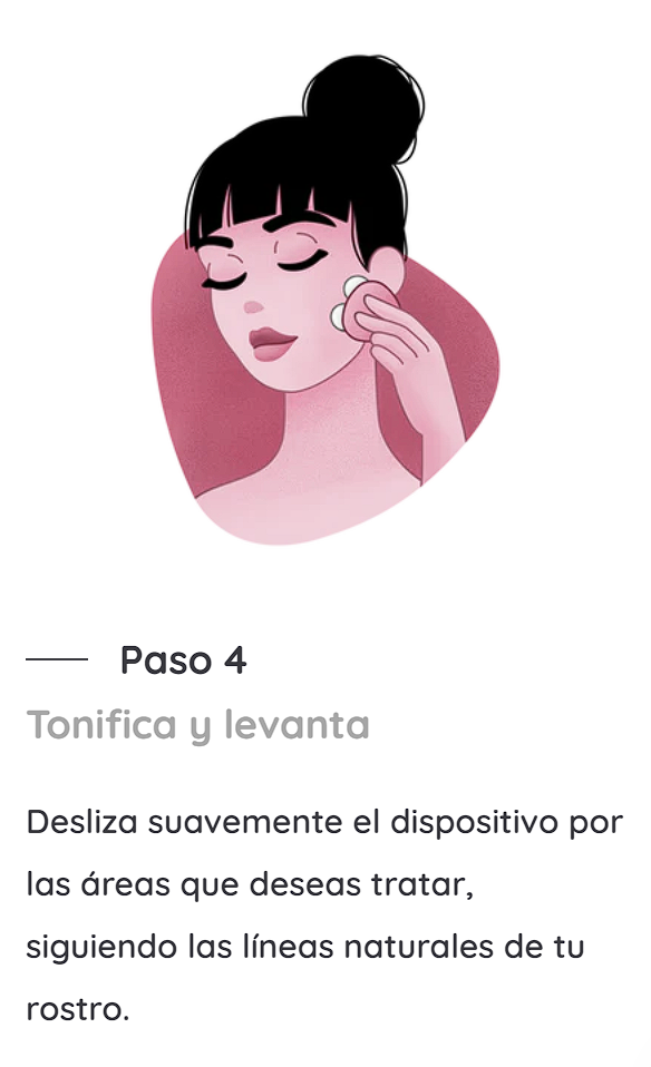Consiste en la aplicación de suaves ondas de energía en la piel que hacen que los músculos de tu cara se contraigan y luego crezcan más fuertes. Es como llevar tu cara al gimnasio, ¡y solo te toma 5 minutos al día!
